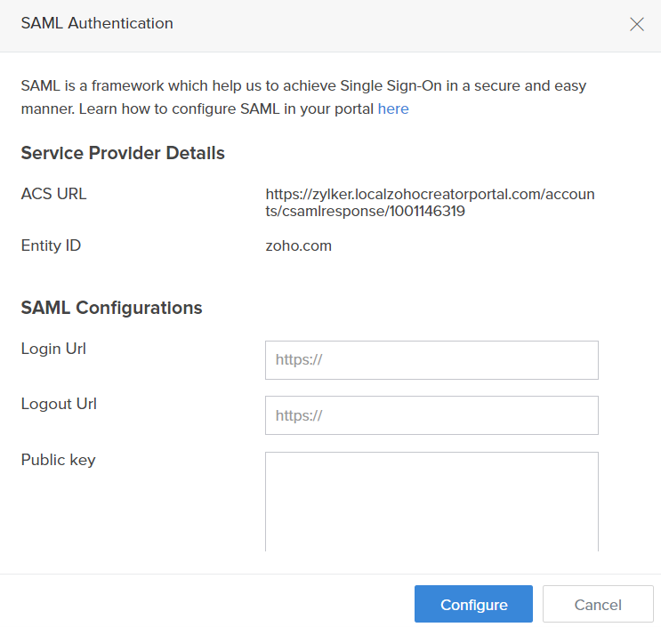 - Under the SAML Authentication tab, ACS URL and Entity ID will be displayed. These two values must be copied and used in the SAML provider. The parameters required by ManageEngine AppCreator Customer for SAML configuration are Login URL, Logout URL and Public Key. These three parameters will be generated by the SAML provider. Copy the values of the three parameters from your SAML provider and paste them in the given fields. The public key can also be saved as a text file and uploaded here.