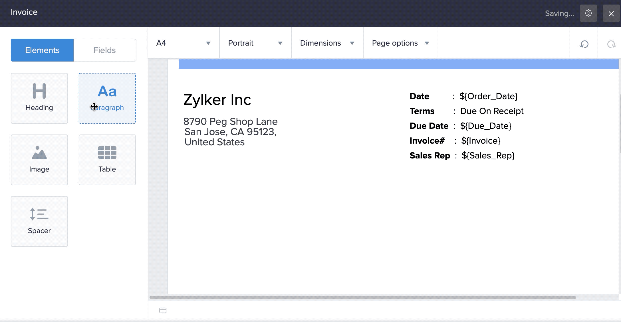 The template designer features predesigned elements that you can drag and drop to the required part of your template. To add one to your template: