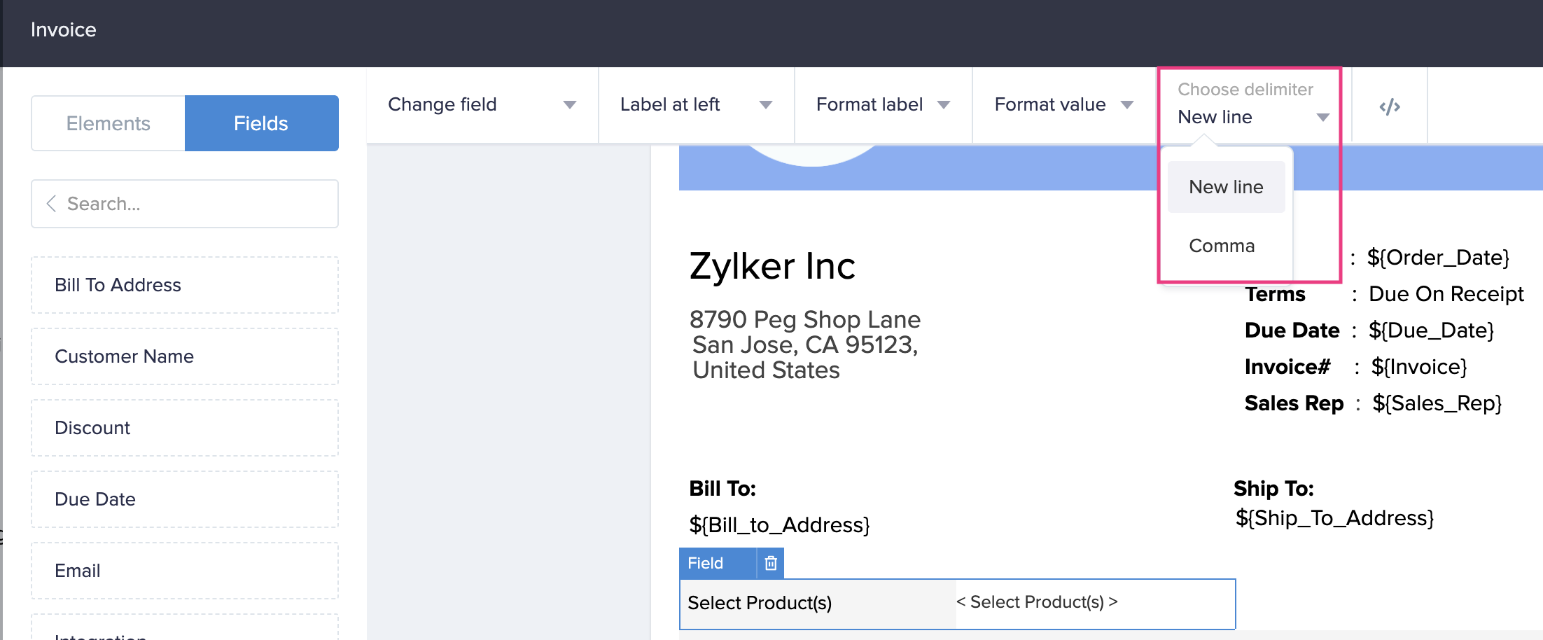 - When you add a multi select, checkbox or lookup (multi select) field to your template, the toolbar lets you choose the delimiter — New line or Comma, to separate the choices.
