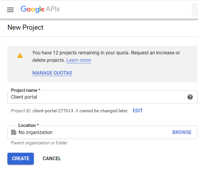 - Go to https://console.developers.google.com/projectcreate
