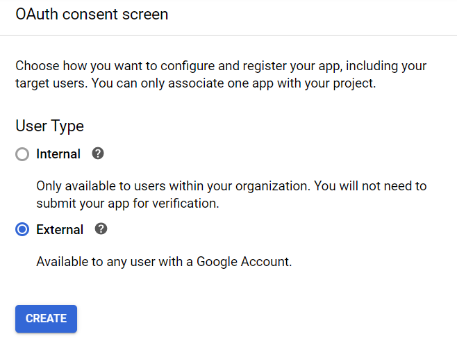 - In the OAuth consent screen choose External under the User Type section.