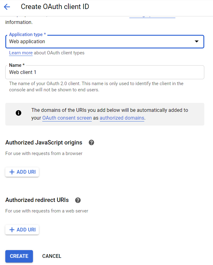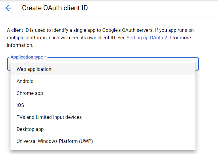 - In the Create OAuth Client ID screen choose Web application in the application type drop down.