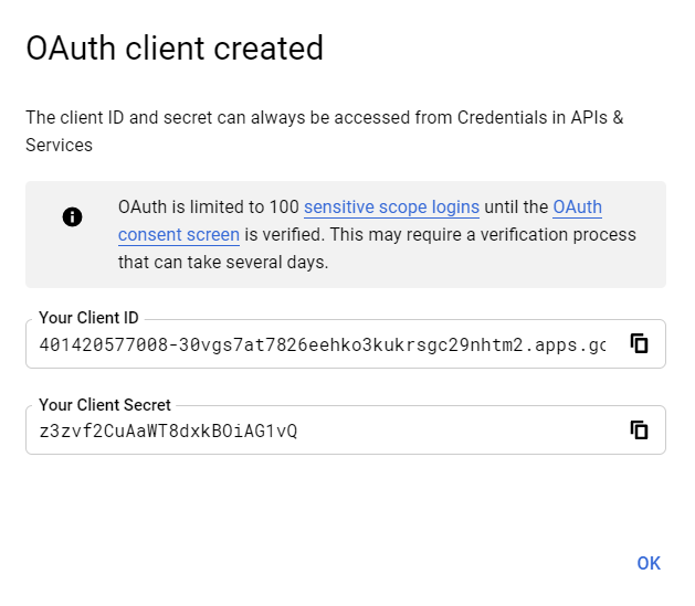 - Now a client will be created. The Client ID and Client Secret will be displayed in a popup. Copy the Client ID and Client Secret.