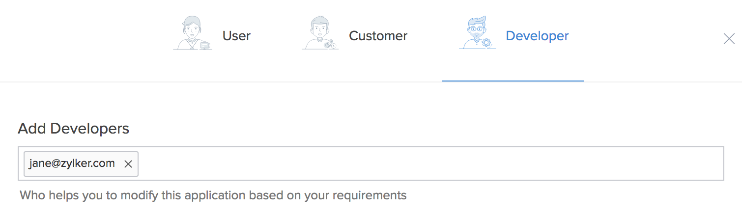 - The Share application tab will appear. This tab contains three different sections : Users, Customers , and Developers. Developers are the induviduals who help you modify the application based on your requirements. To share the application with the developer select the Developers option.