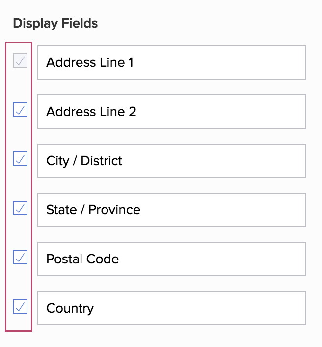 - Check the fields that you wish to display on your form. You can enable or disable all sub-fields except Address Line 1, which has a disabled checkbox next to it: