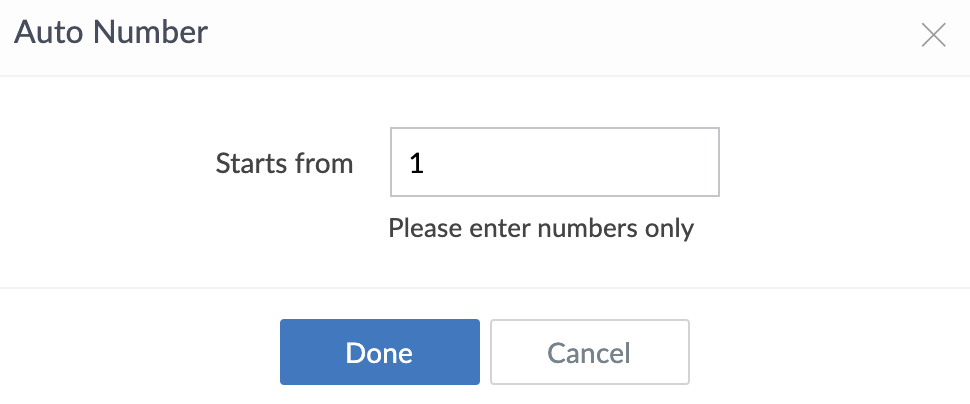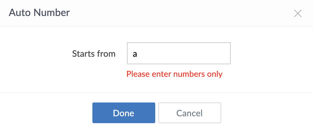If you add an auto number field and set its start index with a number that contains more than 19 digits, ManageEngine AppCreator will prompt the message Please provide a lesser range of number.