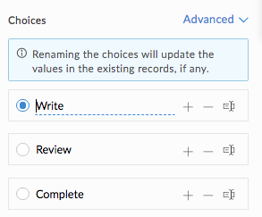 - On renaming the choices, the records with the existing values will be updated with the new choice values, wherever applicable. For instance, you have records with choice values as 'a', 'b', and 'c'. You rename 'a' to 'x'. Once this change is saved, wherever the value 'a' is found in the existing records, it will be replaced with the new value 'x'. But, the values 'b' and 'c' will remain unchanged.