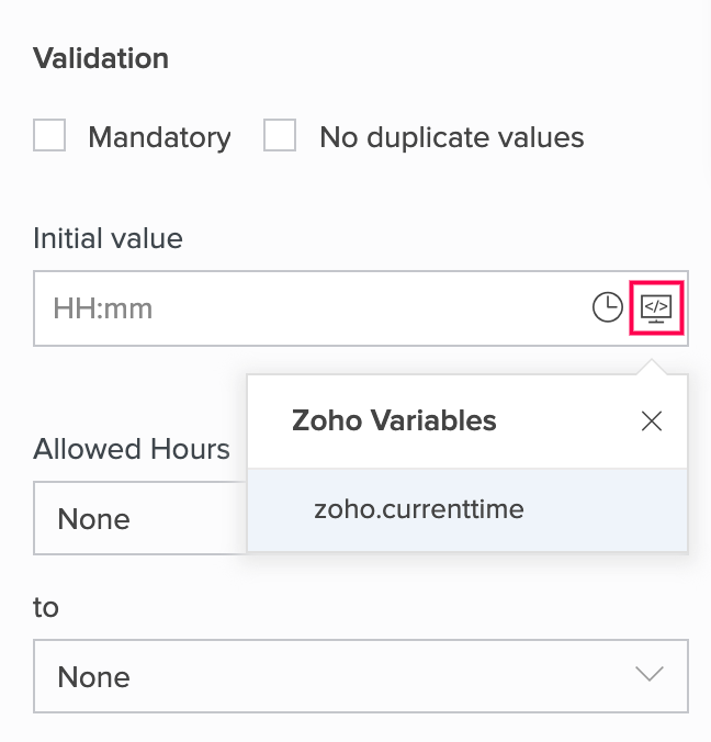 - Click the rightmost icon in the input box below Initial value, then select zoho.currenttime. This will ensure that the current time is set in this field when your users access your form.