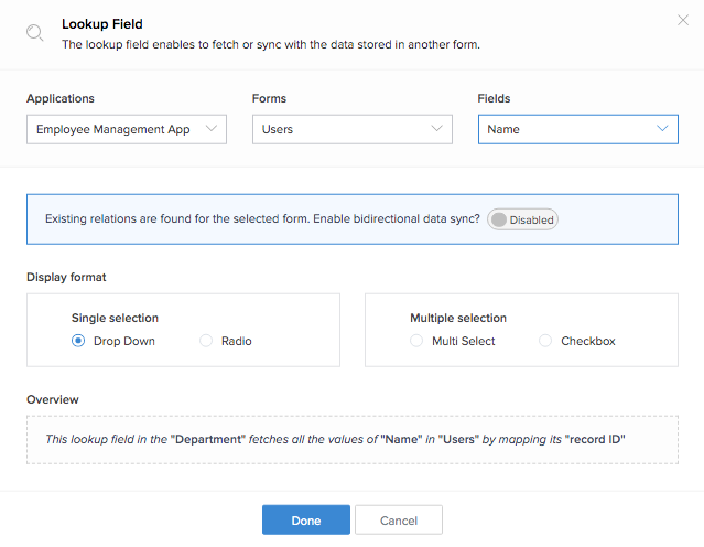 - Click Done. The lookup field will be added.