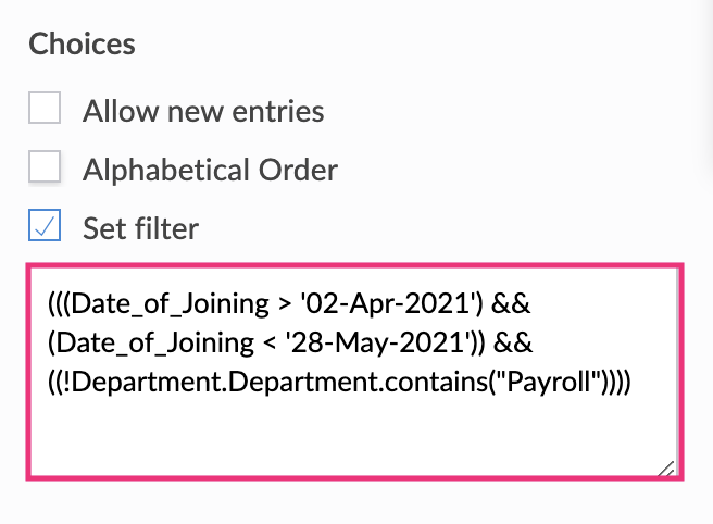 Image depicts setting a filter to make a lookup field Employees display those employees who joined in the month of April-2021 and do not work in the 'Payroll' department - The filter you set will be displayed below the Set Filter checkbox: