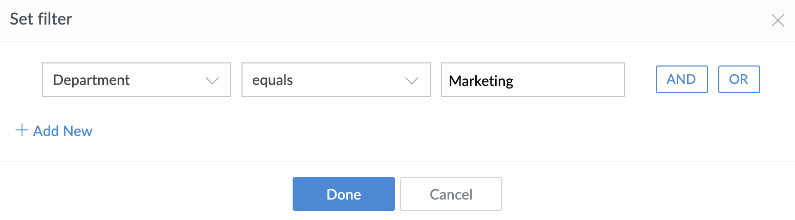 - Set the required filter by adding criteria in the window that appears, then click Done.