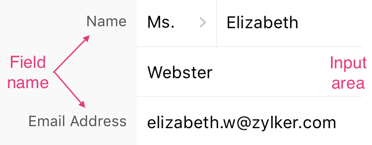 For example, a form to collect the contact details of your employees may contain separate fields to capture name, email address, phone number, residence address, etc. Each record stored in this form represents the contact information of an employee and each field in a record stores one piece of that information.