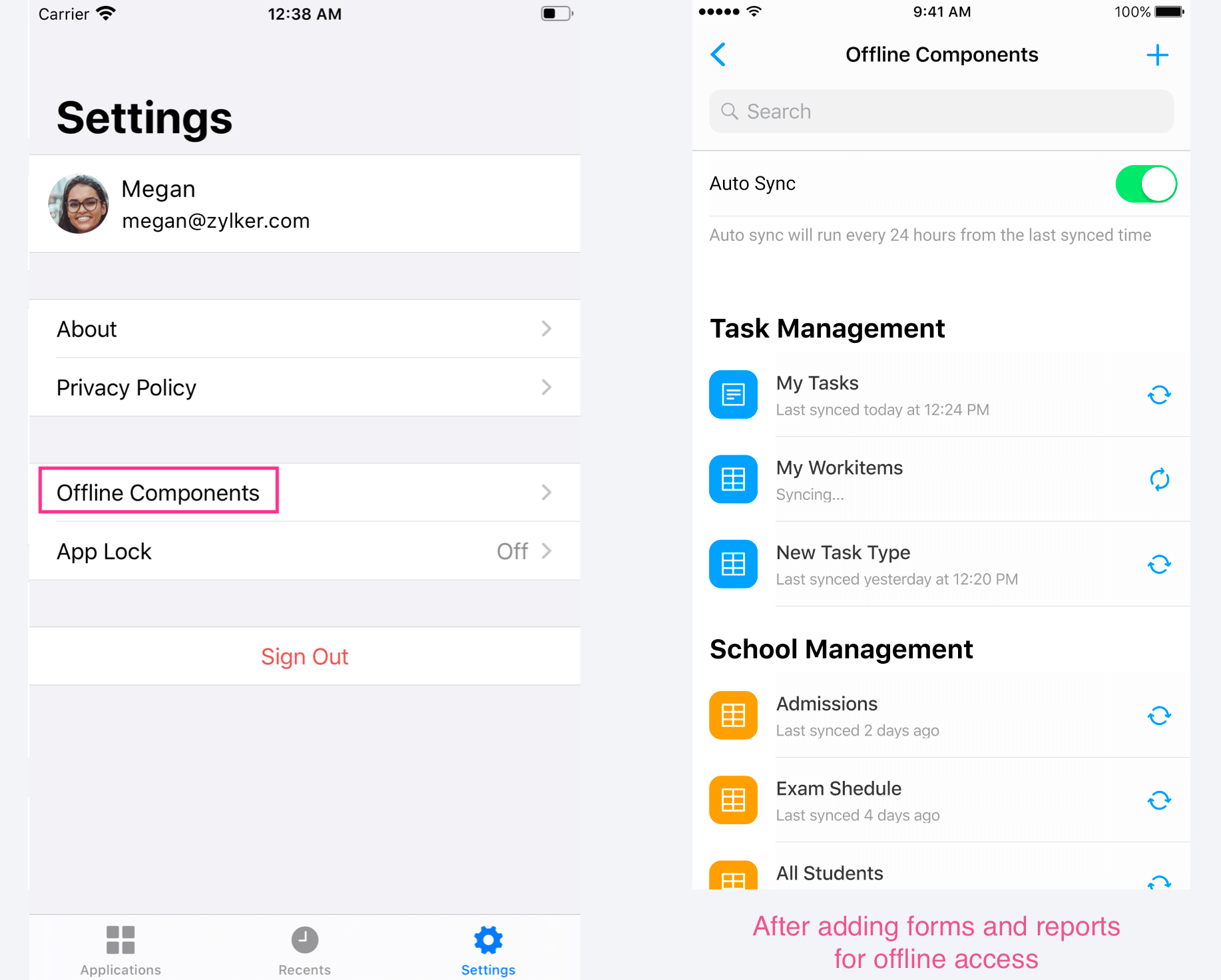 The ManageEngine AppCreator for Android and iOS support offline access for your AppCreator applications. Your end users can navigate to the app's Settings > Offline Components screen to manage their offline access: