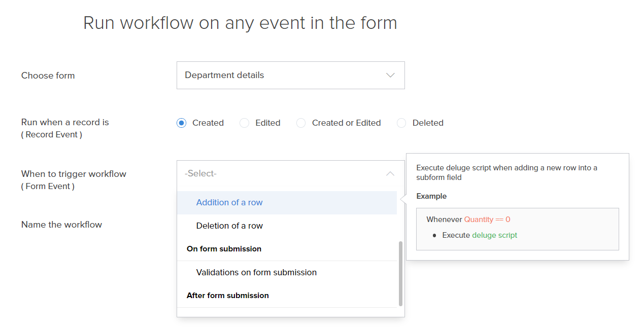 - While creating a new workflow choose the Addition of row option in the When to trigger workflow dropdown.