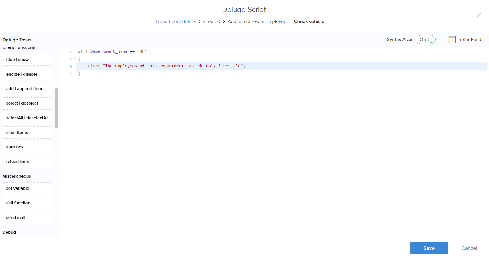 - Additionally, you can refer the field deluge names and functions directly from the code editor. To refer,