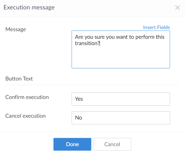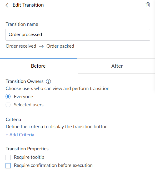 - The Require confirmation before execution option will ask for a confirmation before the transition is executed by the transition owner. To enable it click on the checkbox.