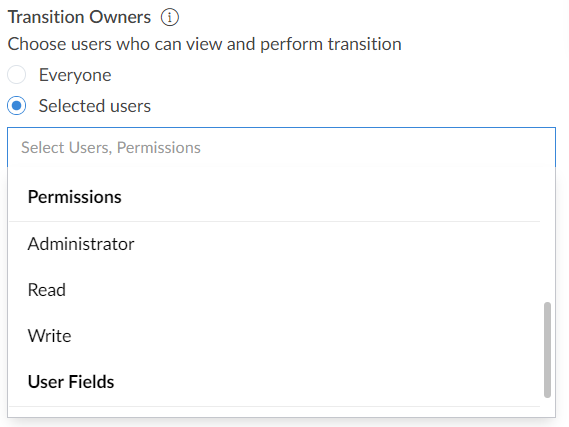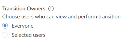 - Transition owners are the users who can view and perform the transition. The Transition owner option determines to whom the transition should be visible.