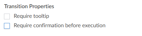 - Including the 'Require tooltip' and 'Require confirmation before execution' options is considered to be among of the best practices while designing the blueprint. These two options include an addition layer of notification and confirmation which helps prevent inadvertent actions by the transition owners.