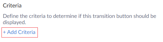 - Criteria is the condition which determines when the transition should be visible to the transition owner. To add transition criteria, Click on Add criteria button.