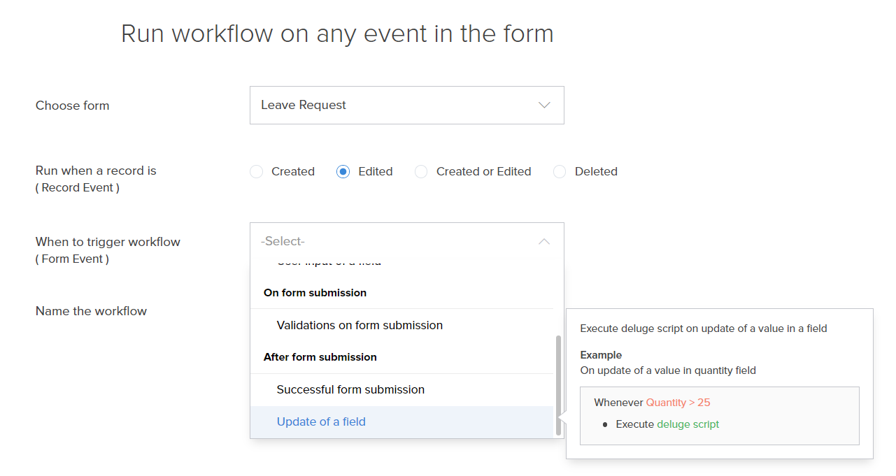 You must create a workflow before configuring the deluge script on update event. Refer this section to learn how to create a form workflow.