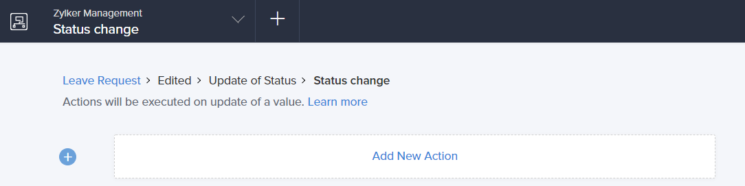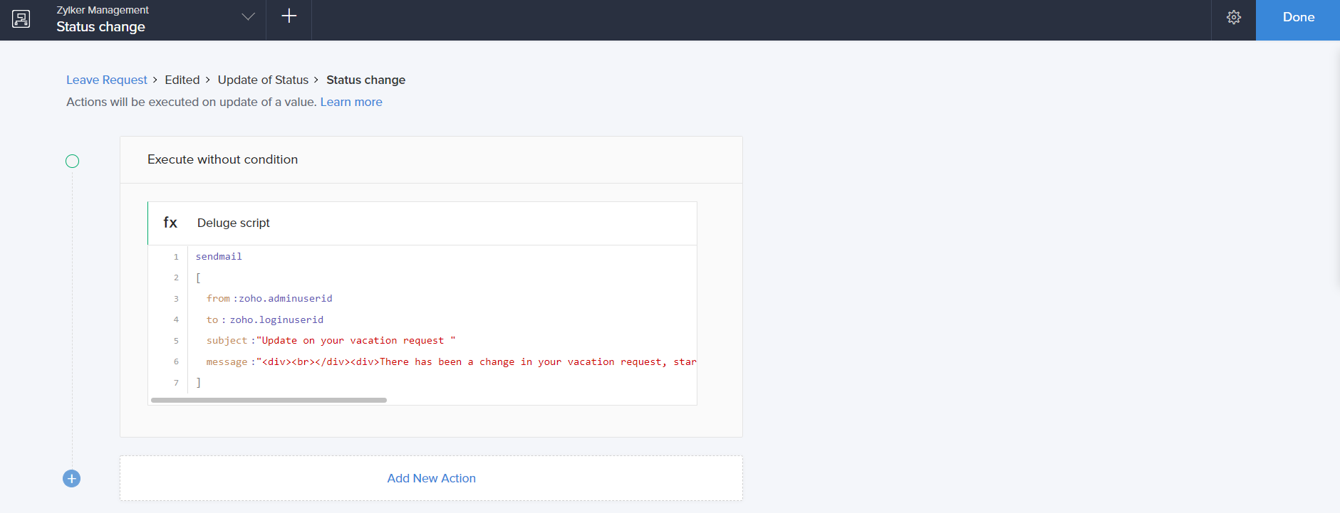 - Click the Add New Action block. The Deluge script builder window will slide in from the right.
