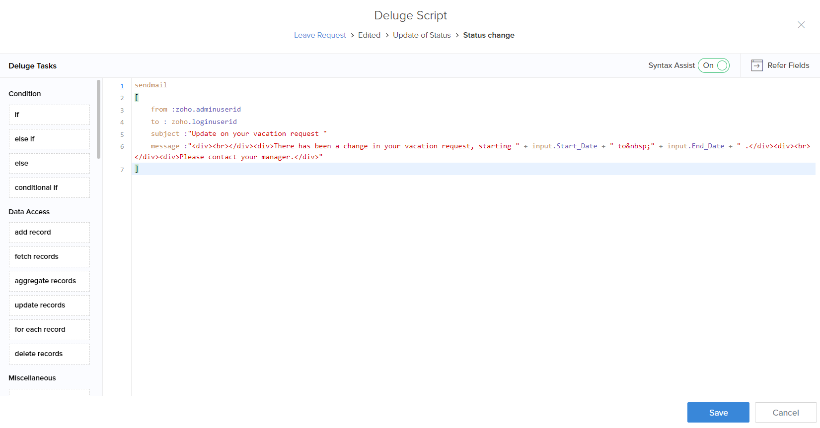 - You can drag and drop the required Deluge tasks to the code editor area. The syntax assist will appear. Replace the syntax with the application logic using the autocomplete feature.
