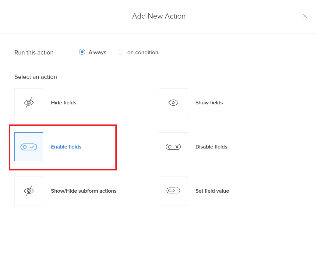The Enable Fields action allows you to selectively enable fields in your form. The target field cannot be edited until the enable rule condition evaluates to true. When the condition is true, the field is dynamically enabled and can be edited.