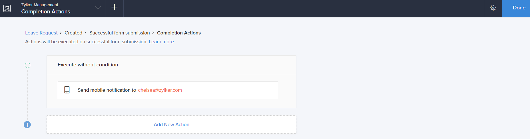 - ManageEngine AppCreator executes the action whenever there is an activity on the form. You can run the action for selected records by setting the criteria. Refer to the Set criteria page to learn more about setting criteria in a workflow.