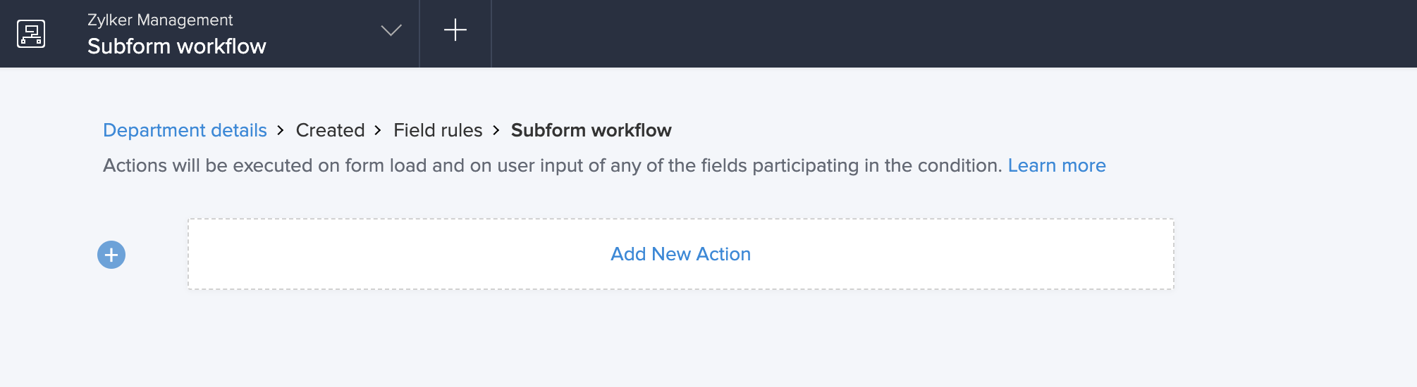 - ManageEngine AppCreator executes the action whenever there is an activity on the form. You can run the action for selected records by setting the criteria. Refer to the Set criteria page to learn more about setting criteria in a workflow.