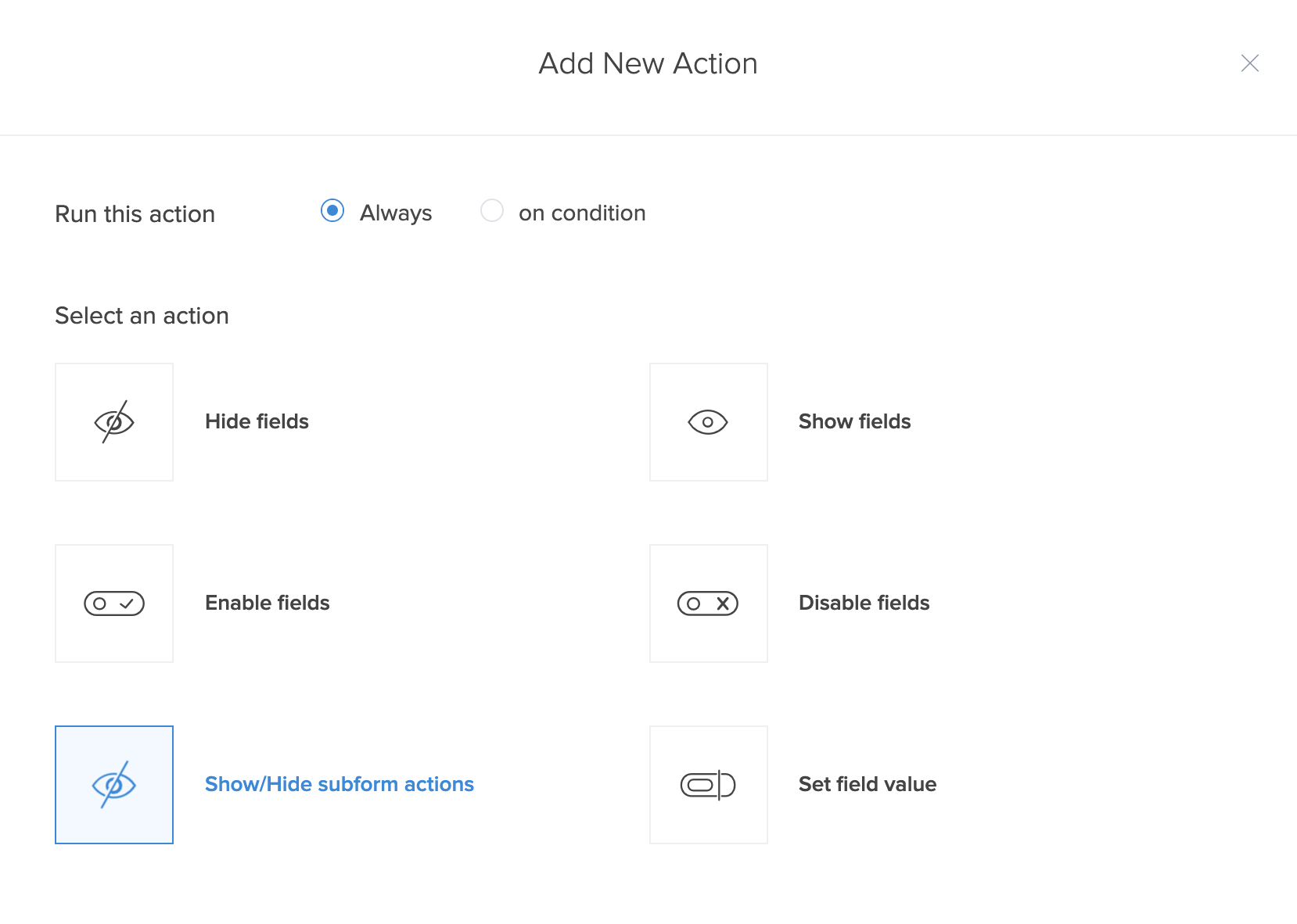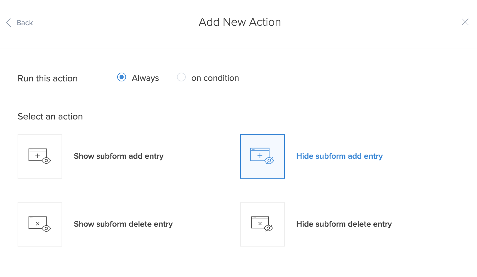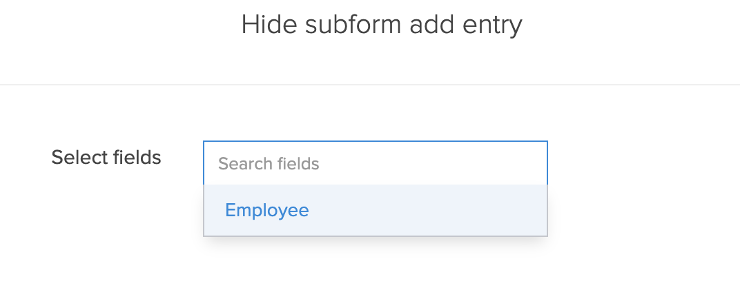 - The Select Fields drop-down lists all the subforms in your form. Select the subform for which the Add entry is to be hidden.