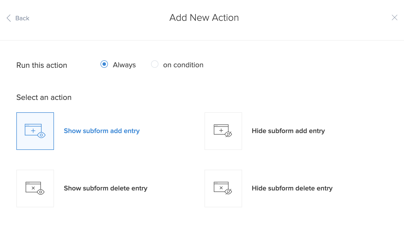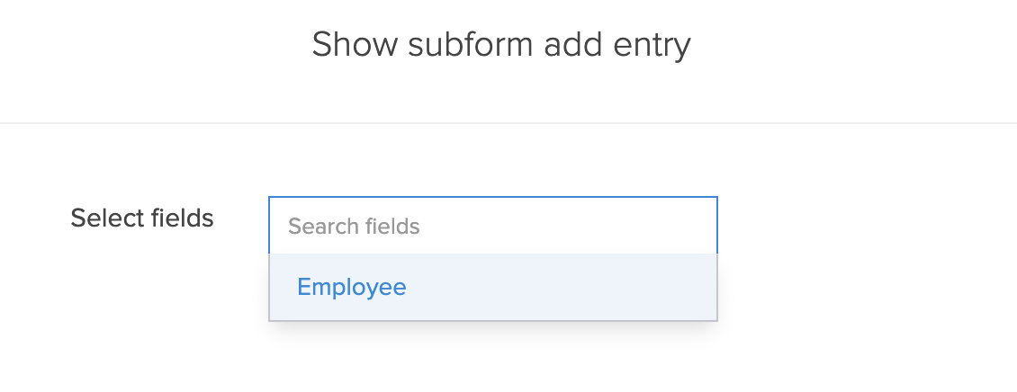 - The Select Fields drop-down lists all the subforms in your form. Select the subform for which the add entry entry has to be shown.