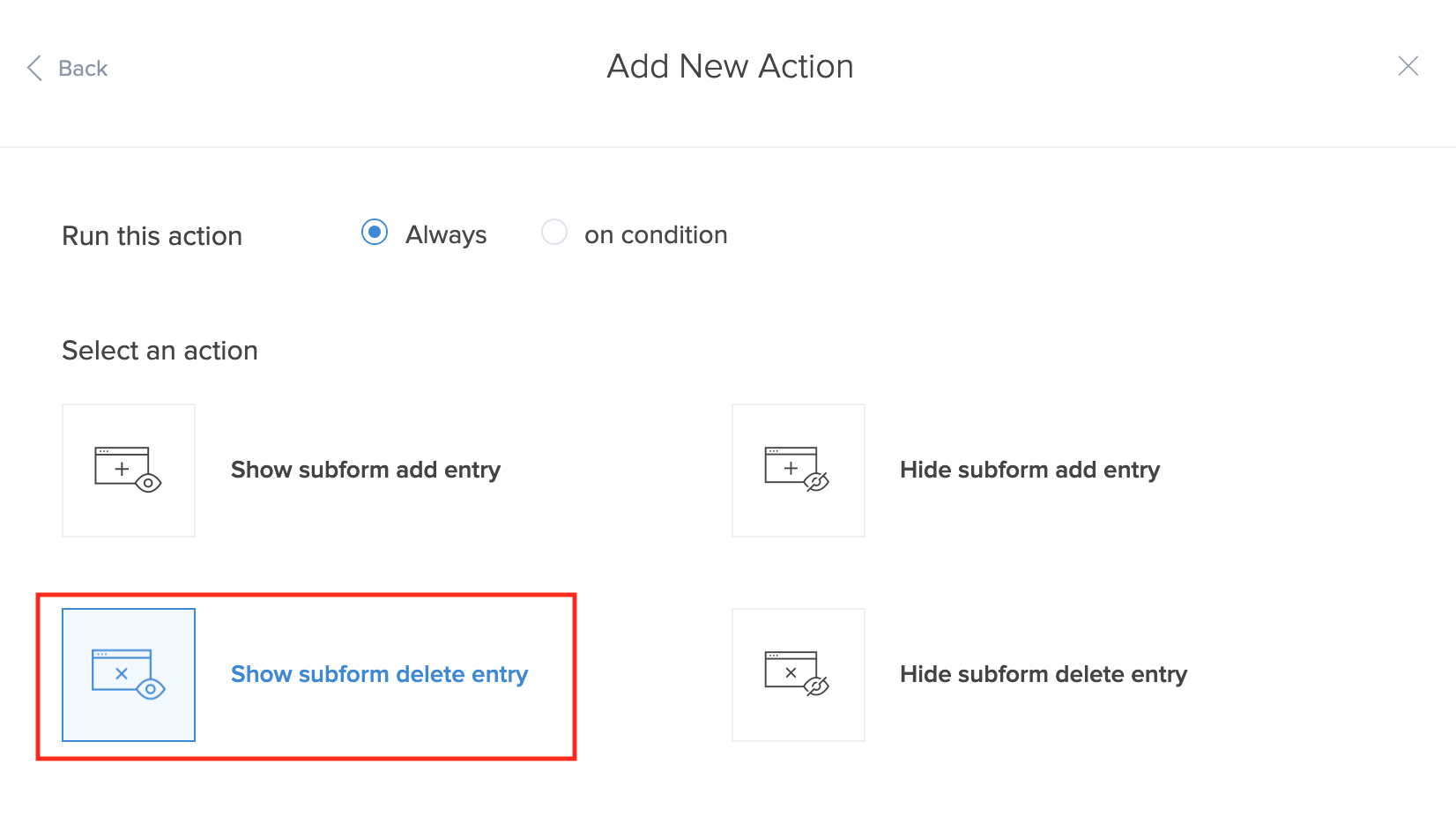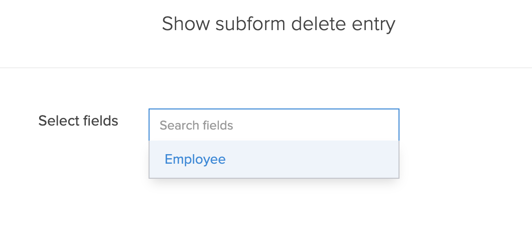 - The Select Fields drop-down lists all the subforms in your form. Select the subform for which the delete entry entry has to be shown.