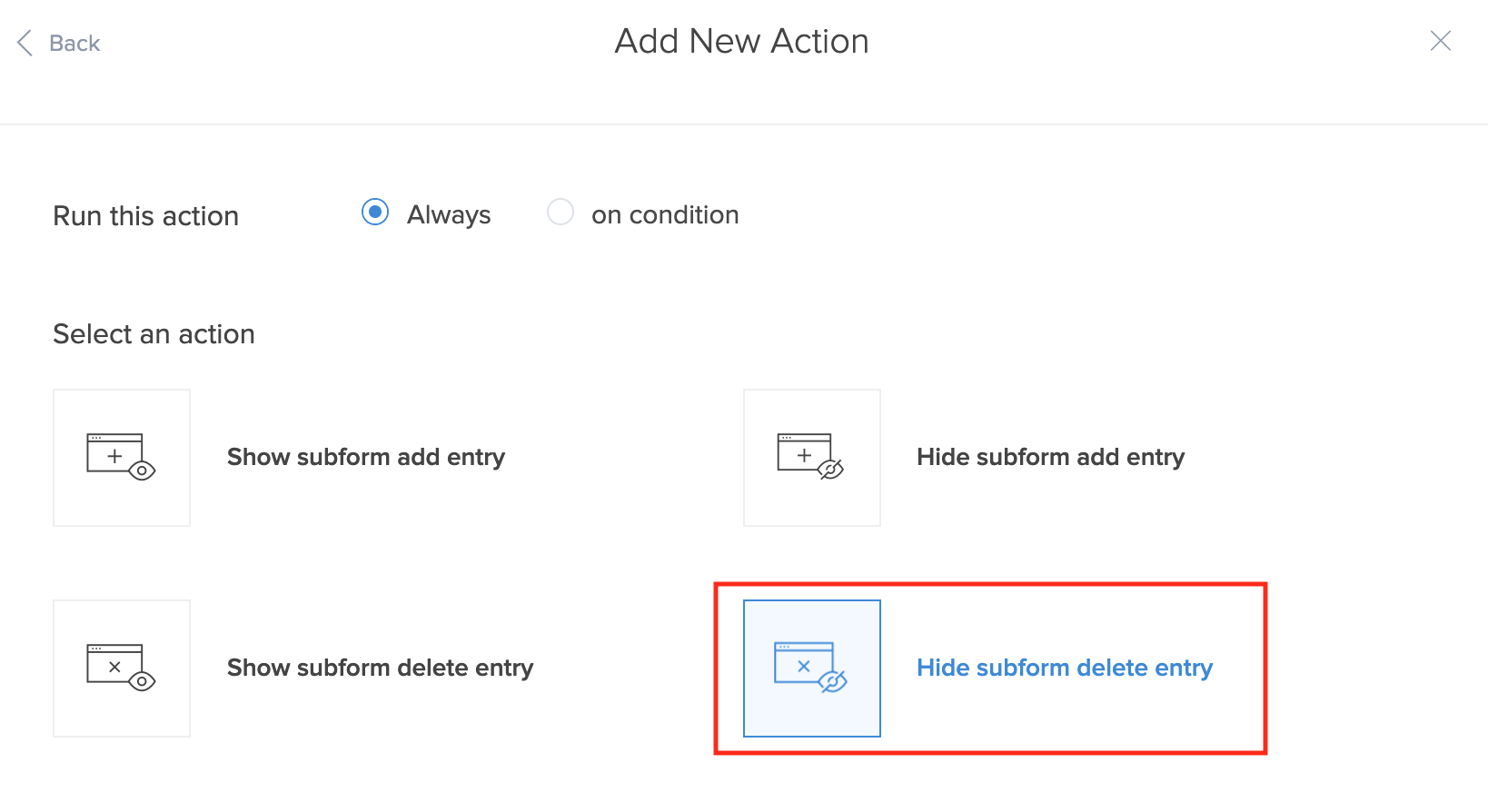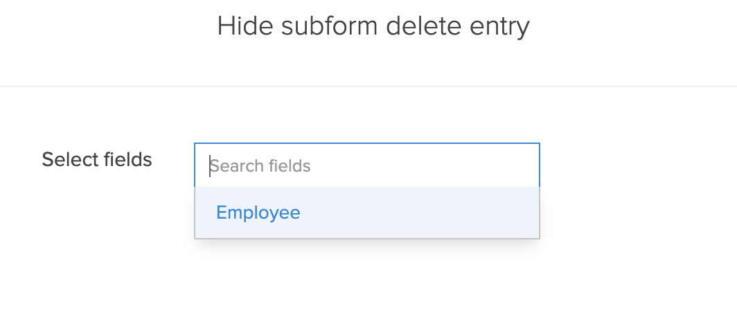 - The Select Fields drop-down lists all the subforms in your form. Select the subform for which the delete entry is to be hidden.