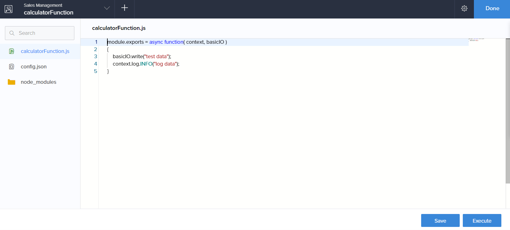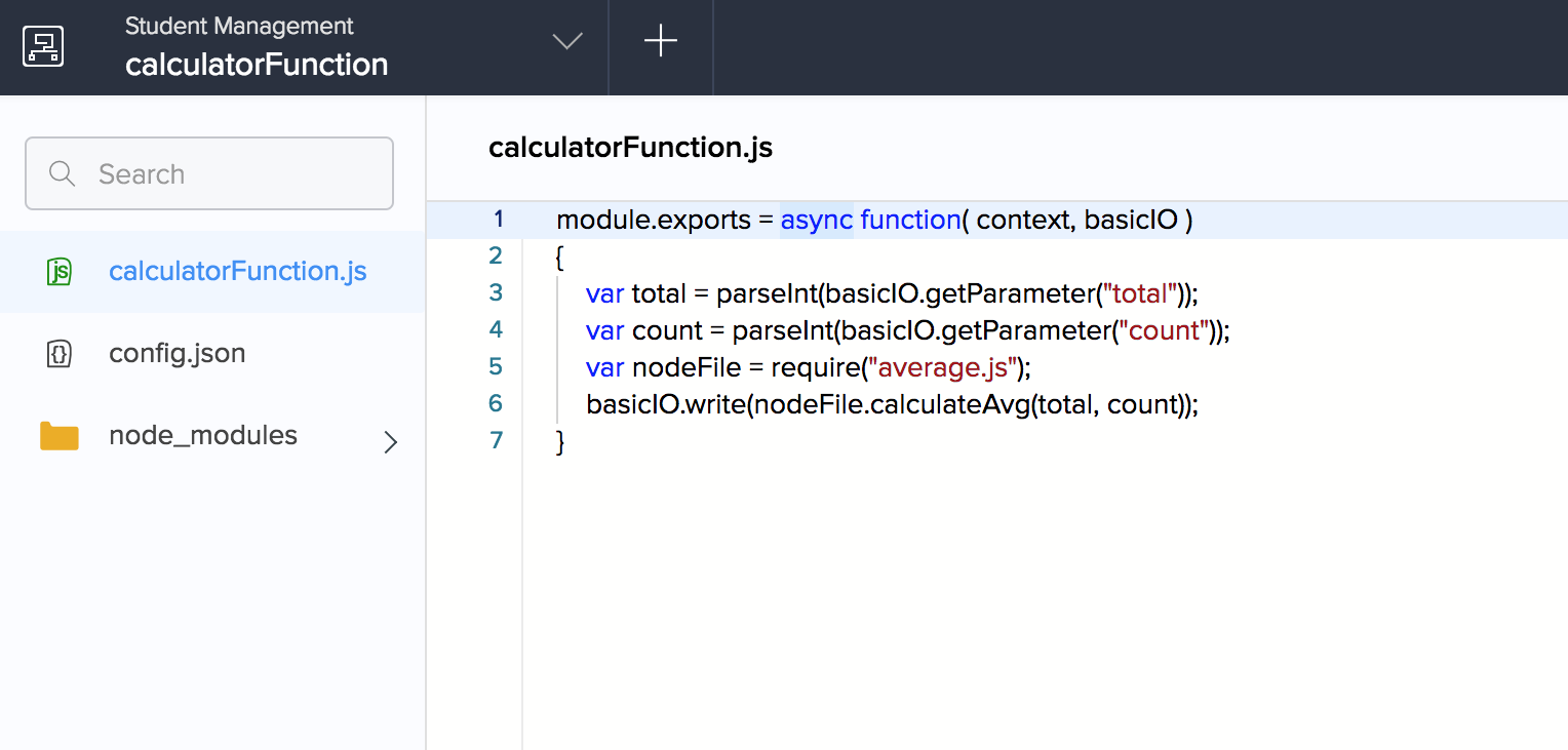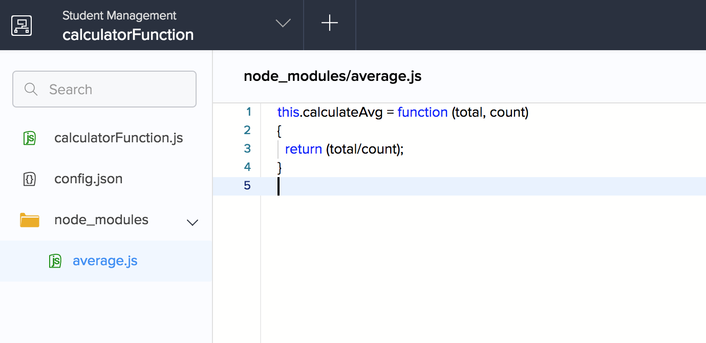 Assign variables to the parameters that you input to obtain the output. In the above mentioned example, the variables are Total (Grand Total) and Count (Number of Subjects). These two parameters will be obtained using the statement basicIO.getParameter statements. The node_modules folder serves as a container for you to upload .js format file that can be used in you node.js functions. You can create the code and save the code in this folder as well and access it from your node.js function. For instance, we have created the average.js file that has the code to calculate the average for the variables total and count. nodeFile = require(average.js) is the syntax used to access the .js file to complete calculation. But, the code for processing the variables to obtain the average can also be directly written in node.js script as well. The node_modules will be of use when you are creating complex calculations or ones that will be repetitively used.