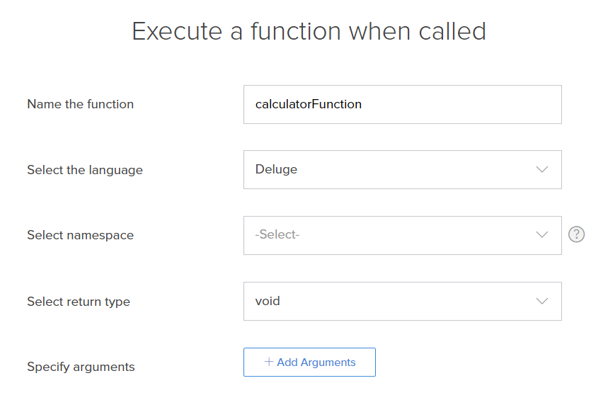 Similar to deluge function, node.js also requires you to specify arguments based on which your function runs. An argument is the instance that is passed to the method on running a function. At the event of creating a node.js function, you can specify an argument. If you have the necessity to add more arguments to the same function at a later stage, you can access the FunctionProperties in the builder (click the Settings icon).