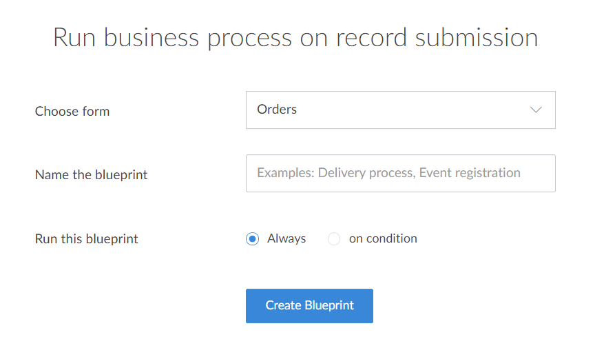 - On the submission of Form the blueprint entry criteria be checked in the listing order of the blueprints. If a record is made to satisfy the blueprint criteria by using deluge it won't enter the blueprint. Changing the entry criteria of the blueprint won't affect the records already associated with the blueprint