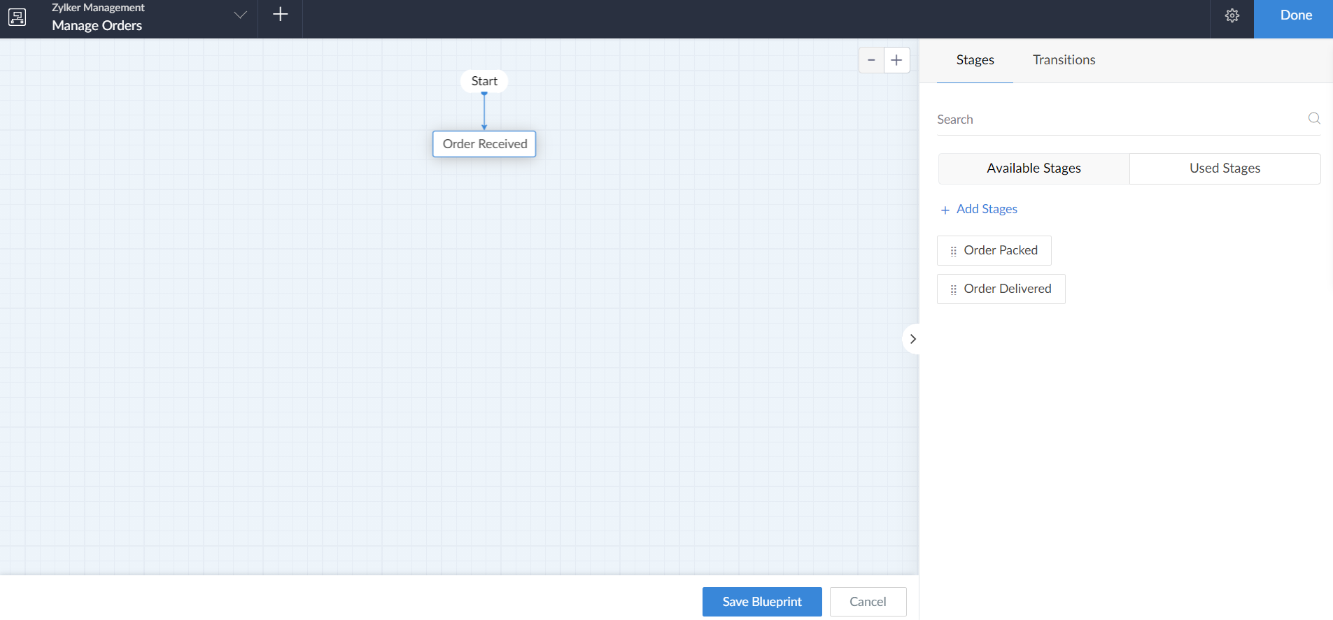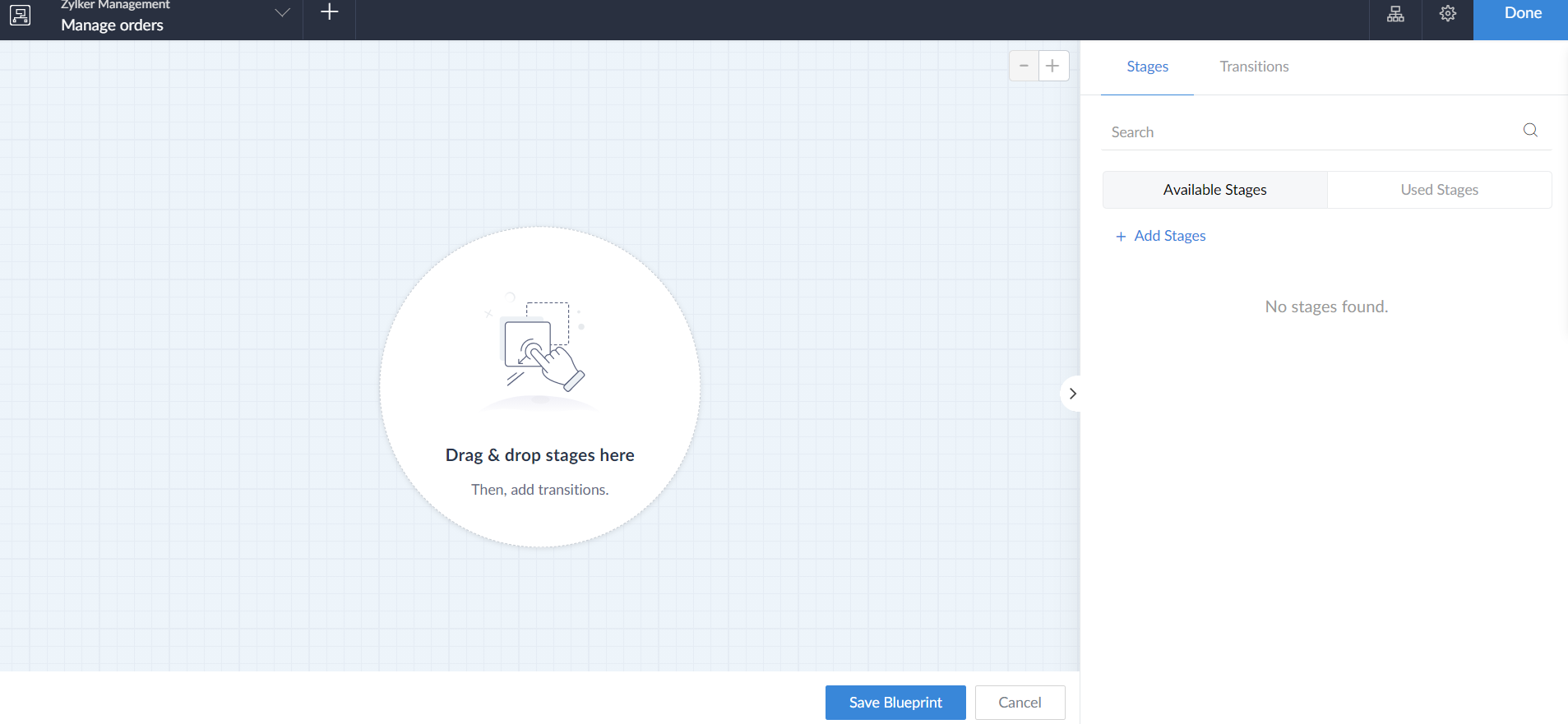 - The blueprint builder will be displayed. The pane on the right will contains two sections: Stages and Transitions.