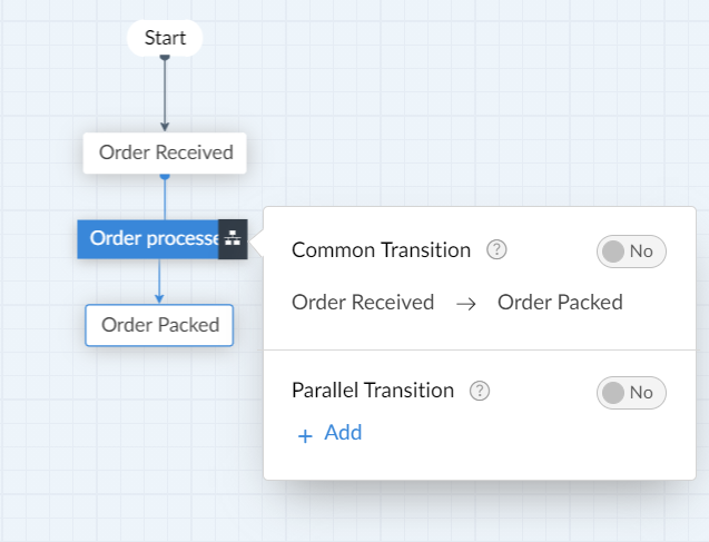 - To choose between Common or Parallel transition, hover over the required transition and click on the icon that appears. A pop up will appear and here the type can be chosen. A parallel transition cannot be a common transition and vice versa.
