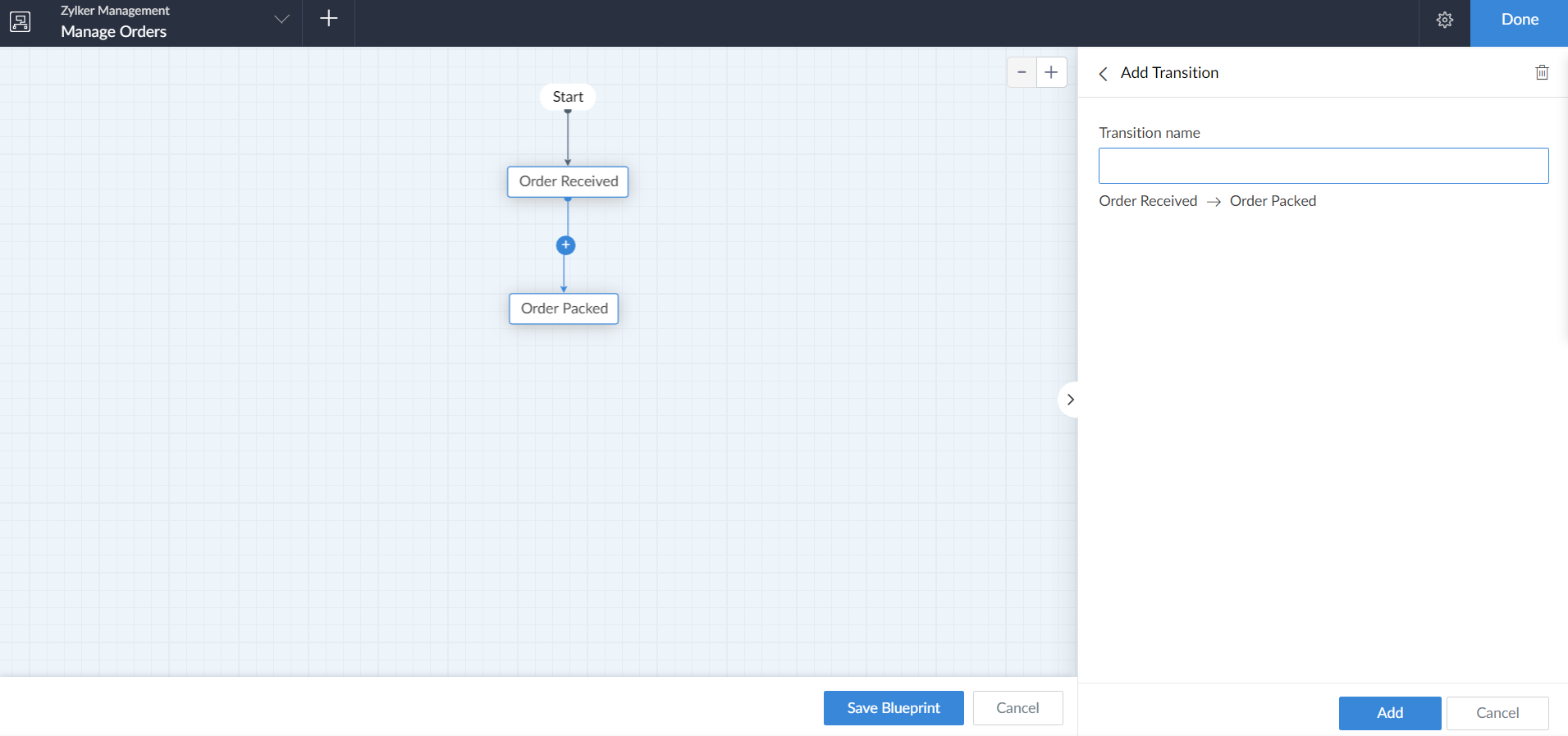 - Once the connector is dragged between two stages the Add transition pane will appear. Enter the name for the transition and click Add.