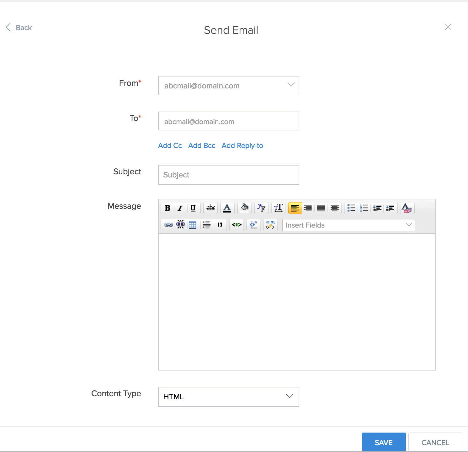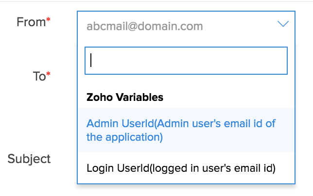 - Specify the From/To address. You can also assign the admin/login user email addresses as the From address. To do this, mouse over the From/To address field and select the Zoho variable from the list.