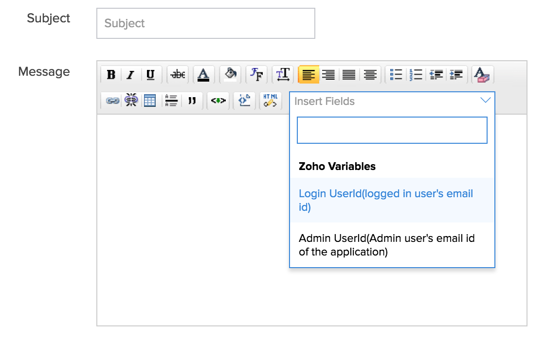 - Specify the subject and notification message. Insert Form field values dynamically in the Message field by selecting the required variable under the Insert Fields drop-down in the Message editor.