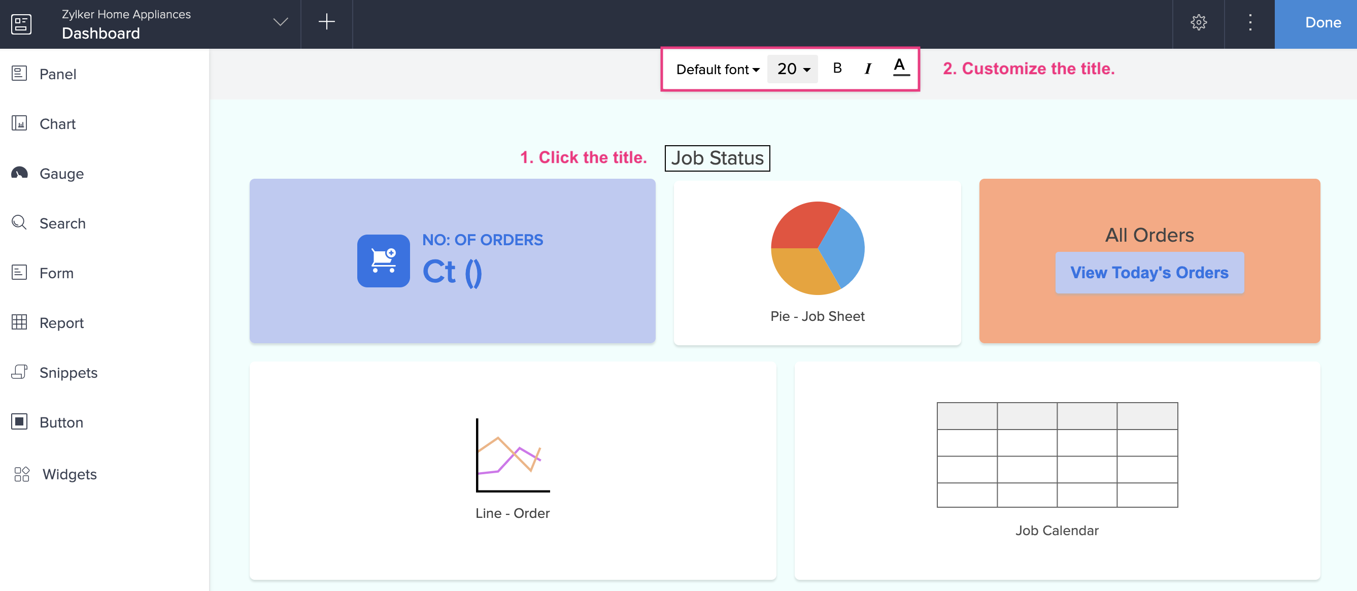 - A Title field is generated at the top left of the selected element and a pop up window appears to Configure Title.