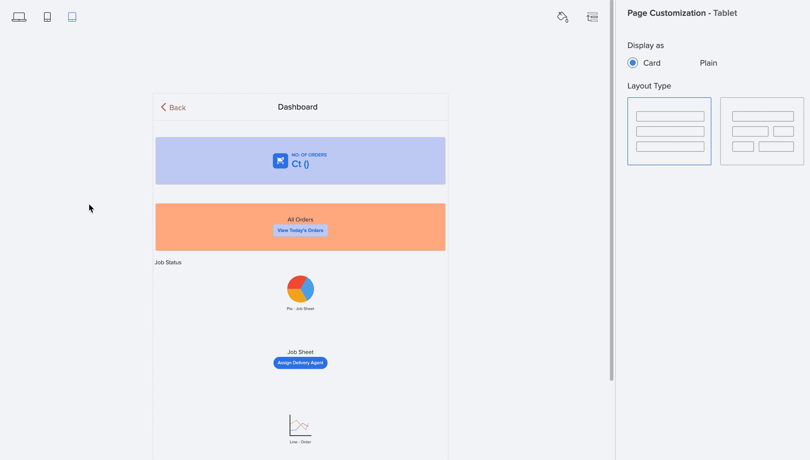 Display type Description Card Card view displays each element of the page like a panel, form, report, chart, snippet or a button as a card. Plain Plain layout simply lays the elements flat, with a border separation. - Now, select a Layout Type: