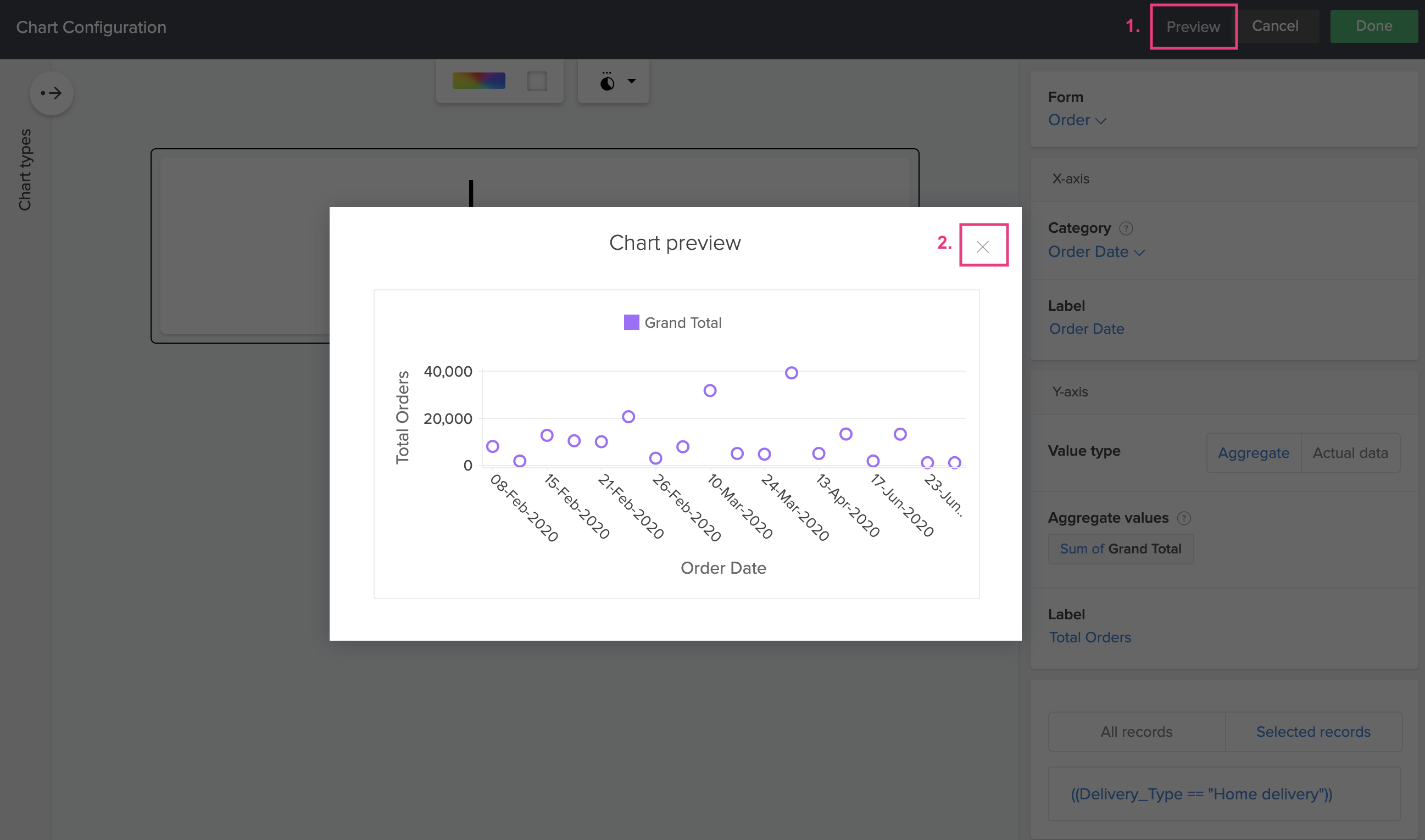 - Click the Preview option at the top right of the Chart Configuration pane to view a preview of the configured chart.