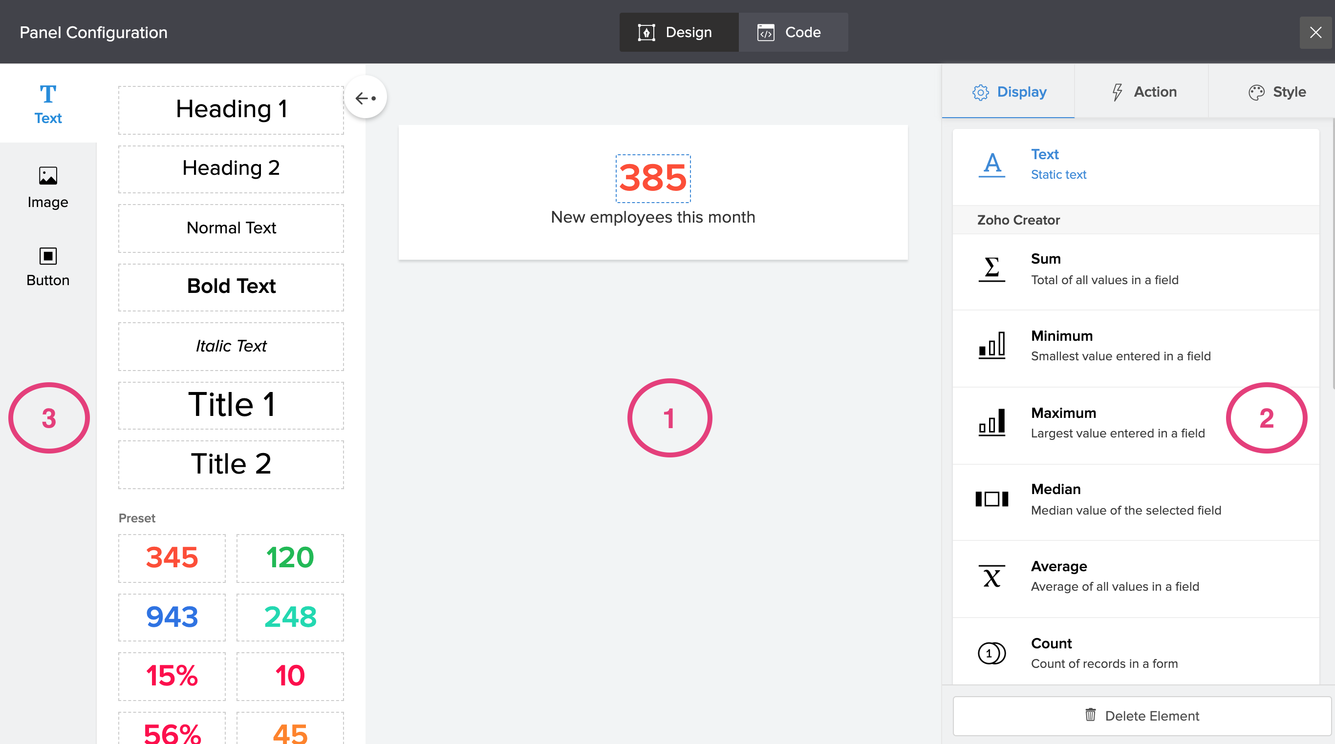 - Configuration menu: The menu on the right side of the panel builder is the configuration menu. You can add display content, action and style to each of your panel's element from here.