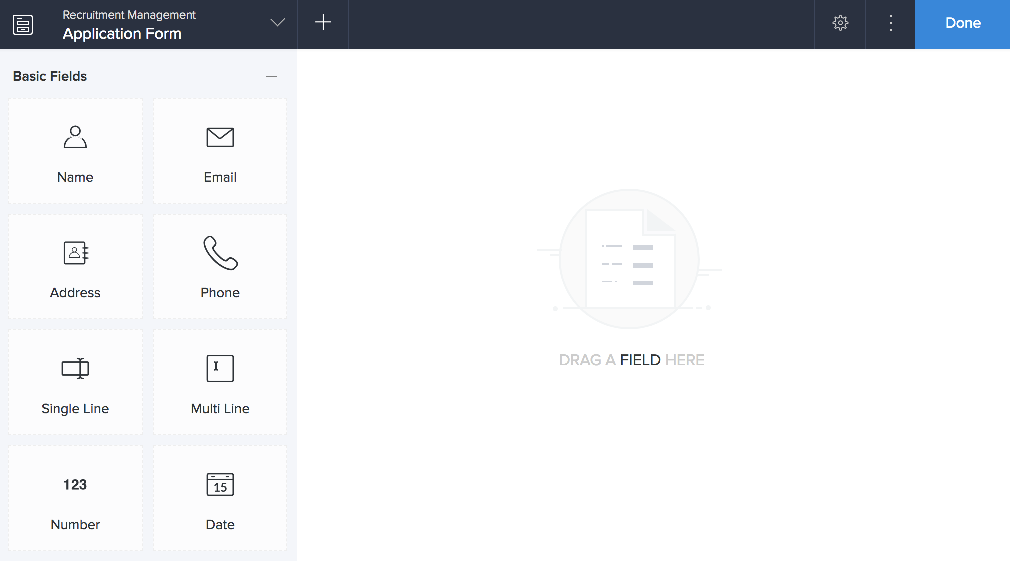 Type of Field Set its Field name as Configure its Field Properties Email Email Address Set as Mandatory Phone Phone Number - File upload Resume Set as Mandatory - Click Done, displayed at the top-right corner of the form builder: