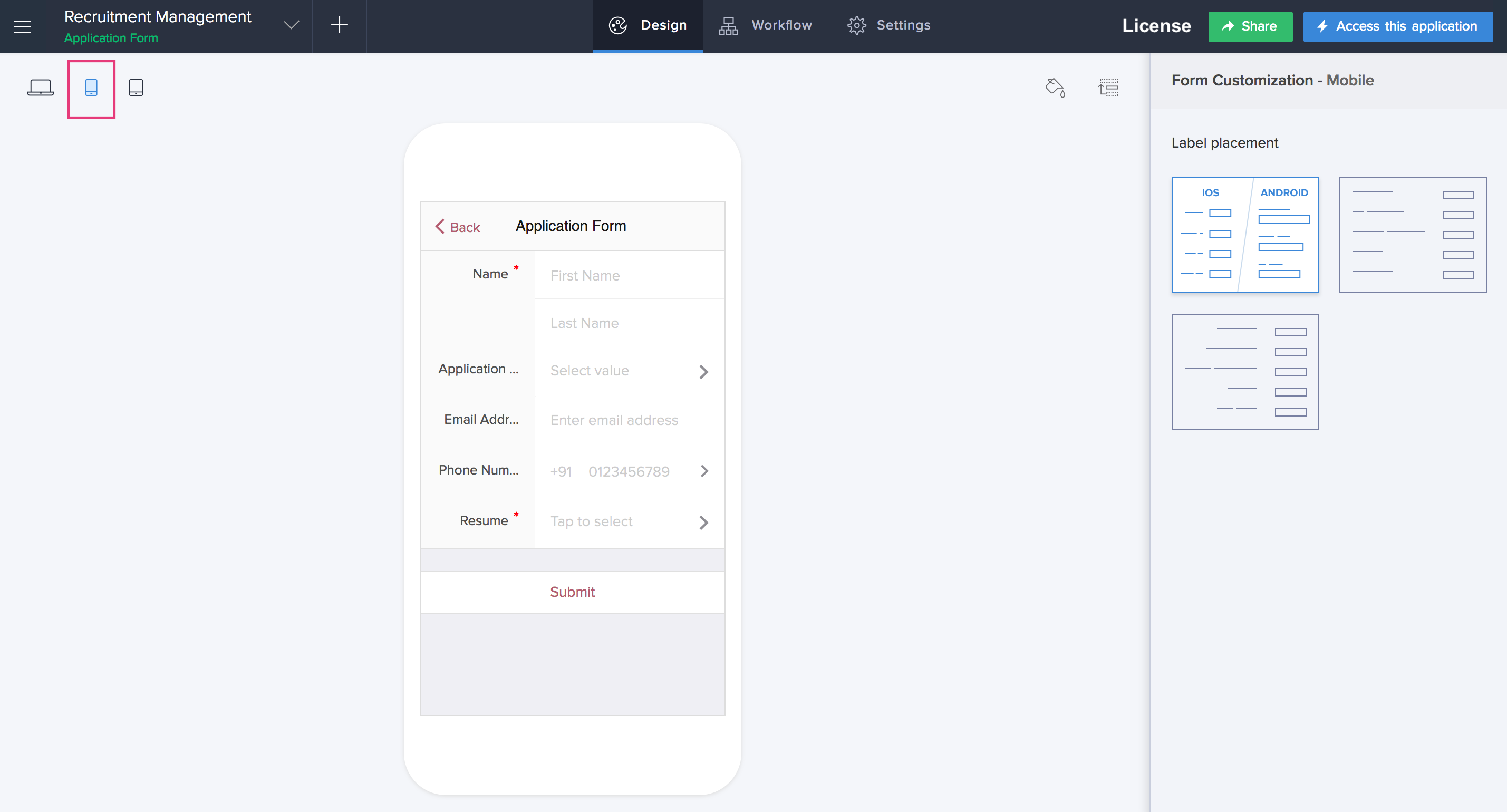 Click the Phone icon as shown below. The Design page of the Application Form, with the preview of how it will look when accessed on a smartphone, will appear: