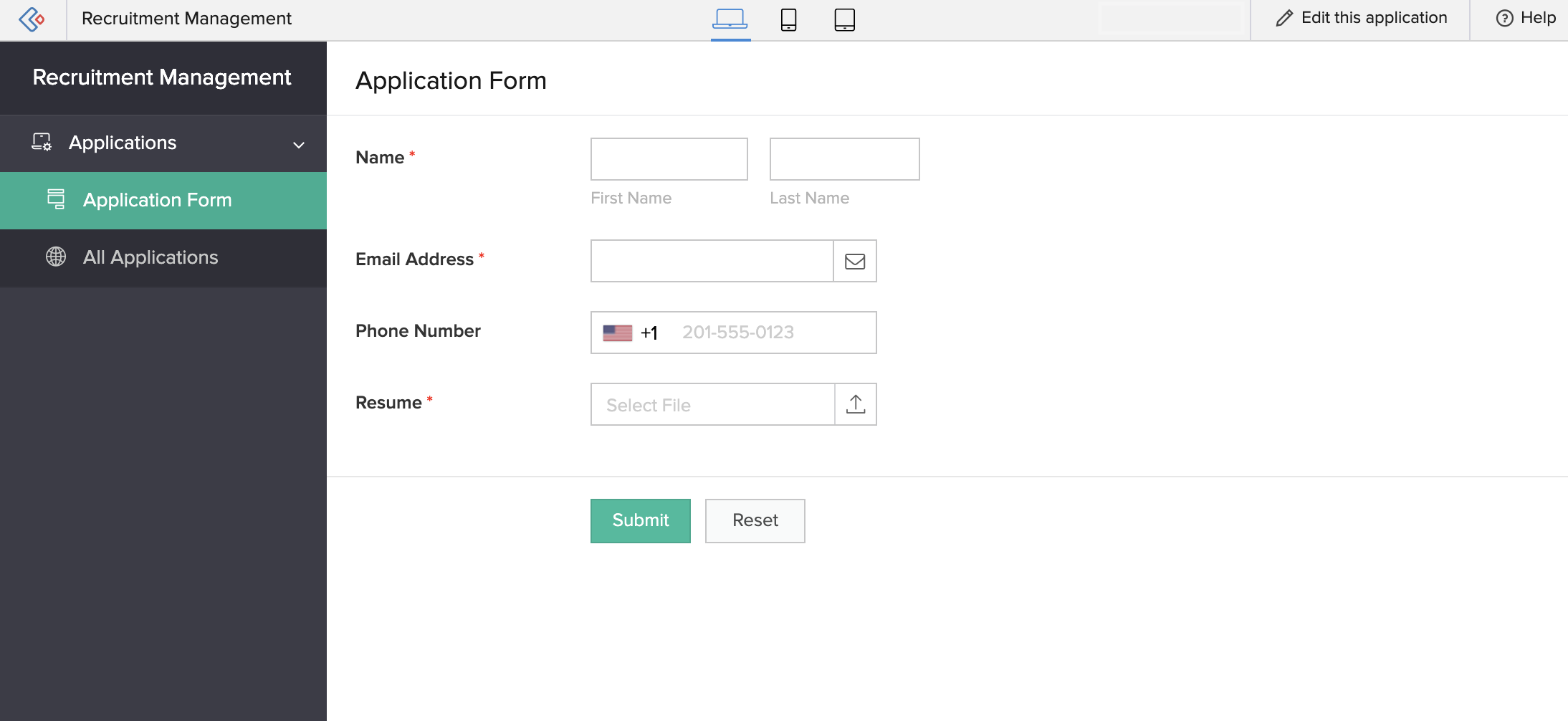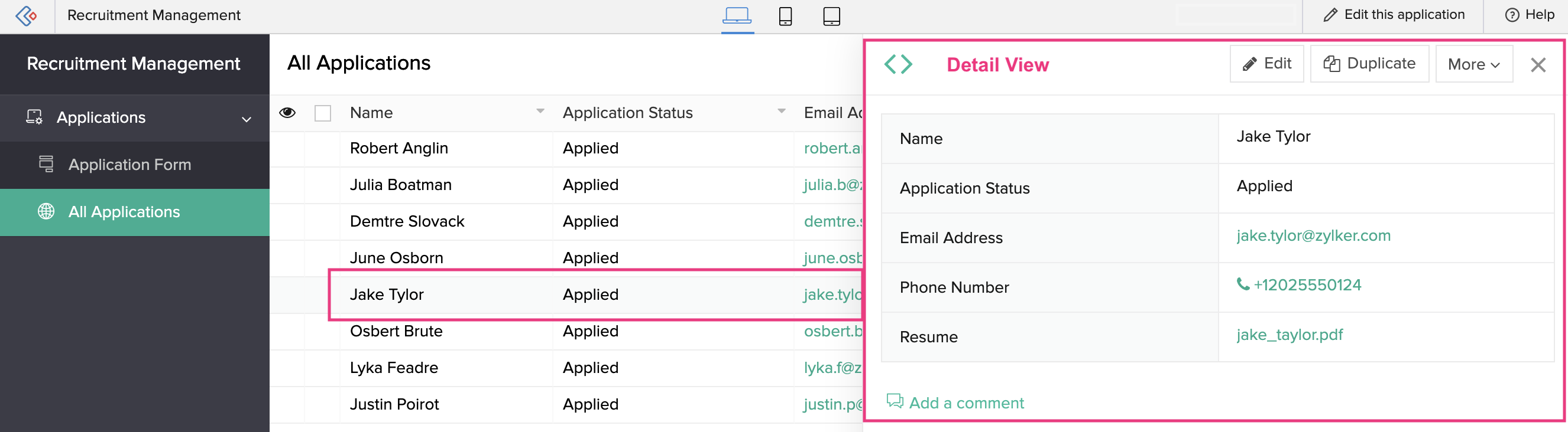 If you go through all the steps you've covered so far, you'll notice that nowhere did you create this report. When you create a form, ManageEngine AppCreator automatically creates a list report for it. A report is the component of a ManageEngine AppCreator app that enables your users to view the data submitted through a form. All Applications is the default list report of the Application Form.