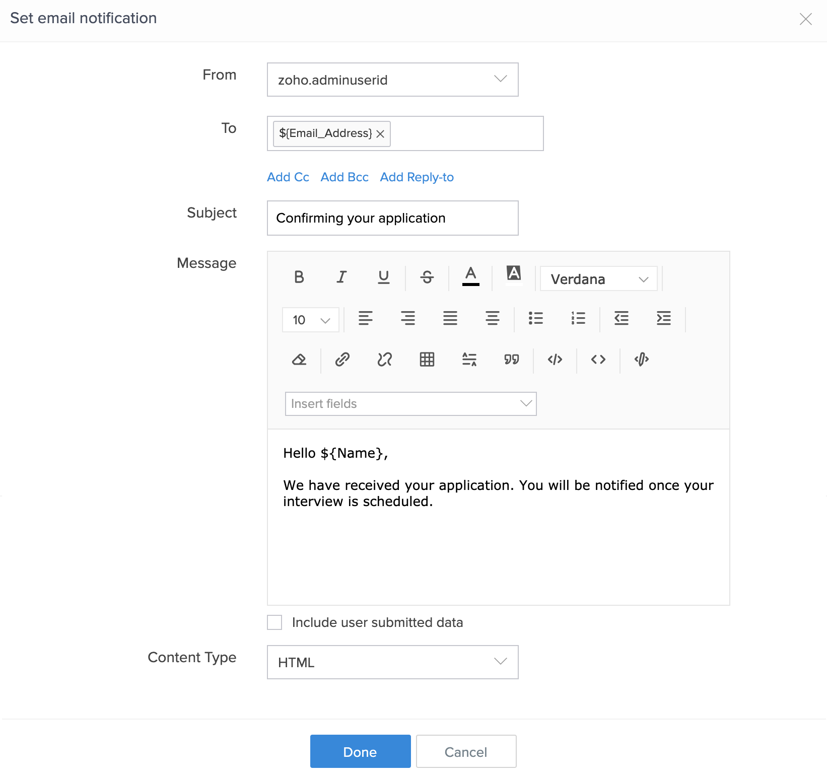 | Automate notifying candidates that their applications were submitted successfully | Enable sending email notification whenever a candidate submits the Form |