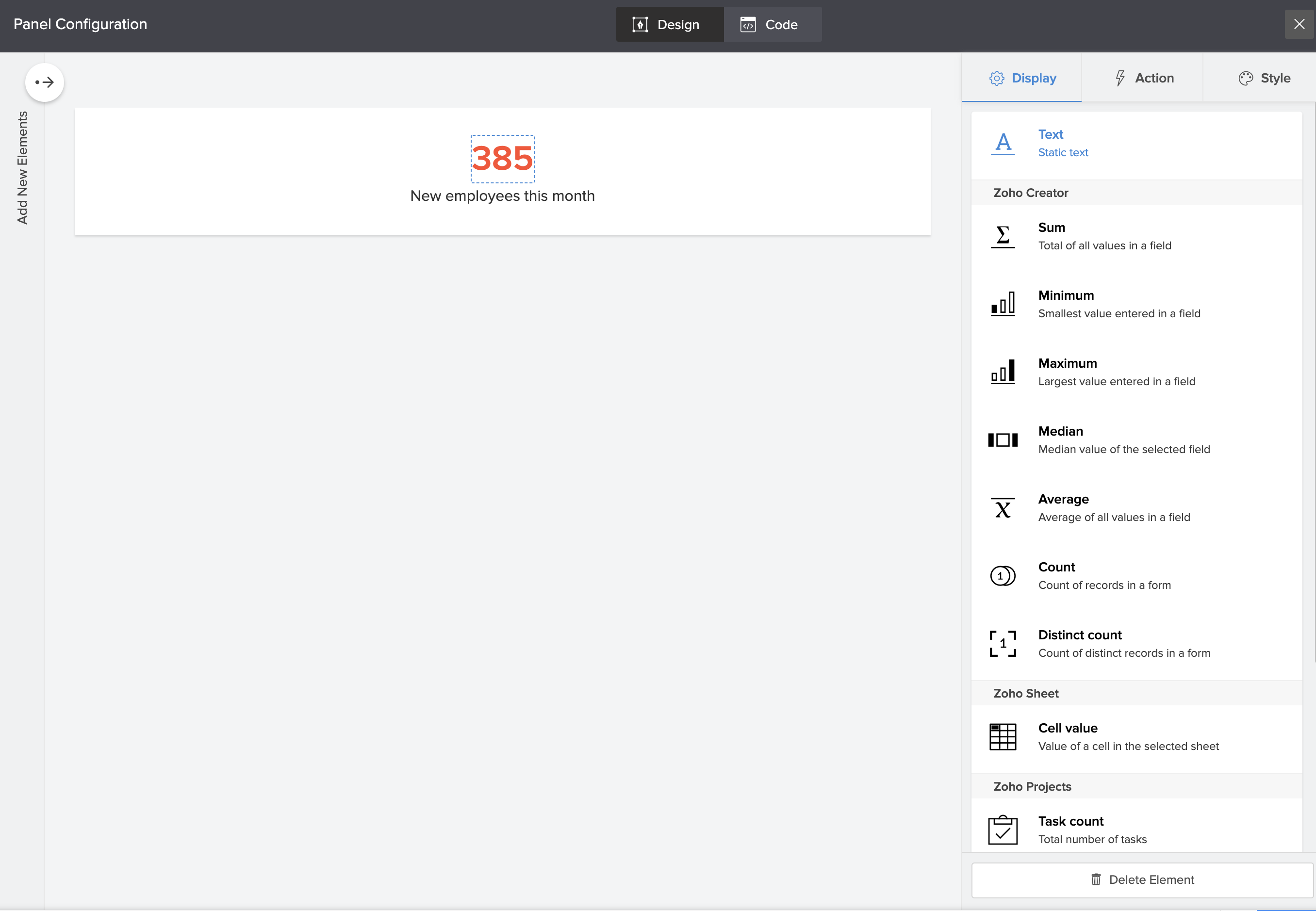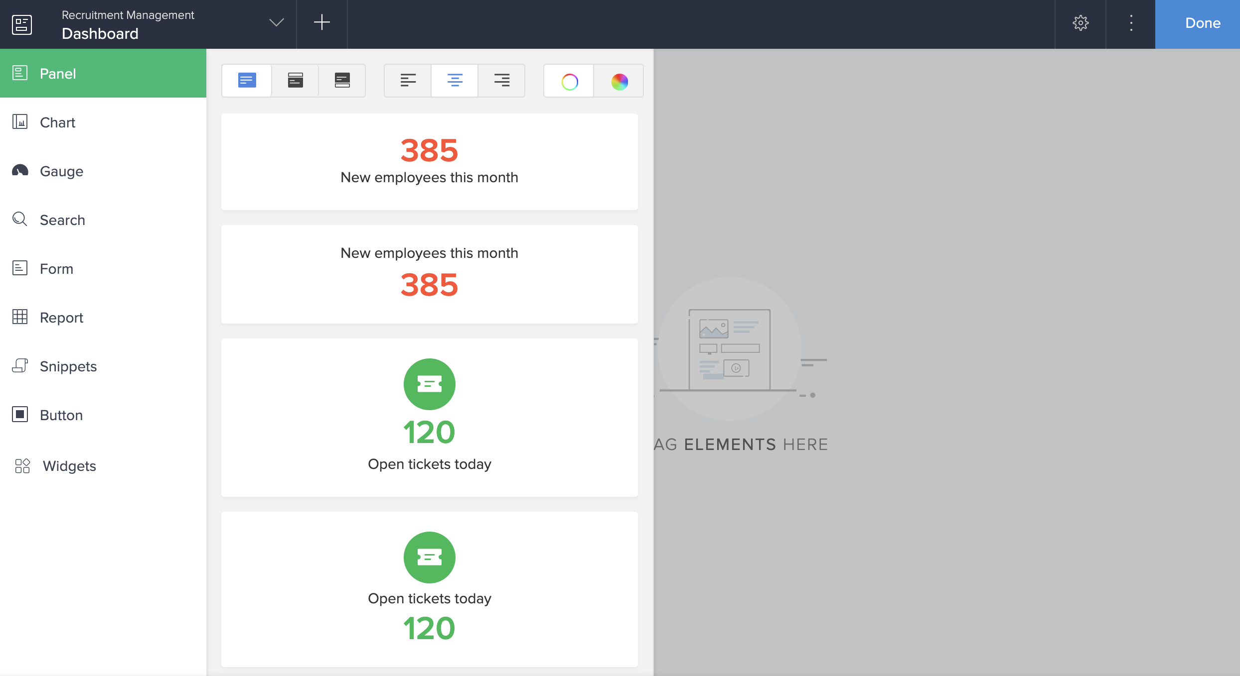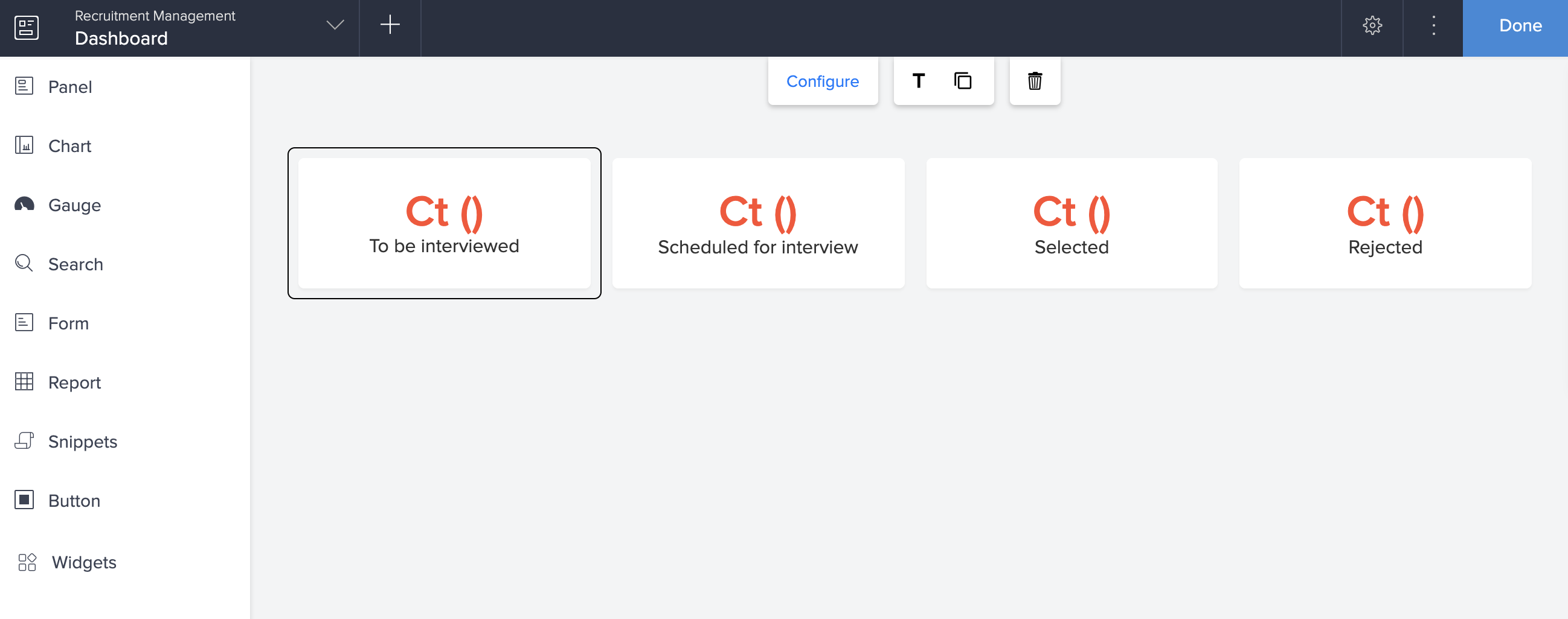 - Click Panel on the left, then repeat steps 4 to 11 such that you have a total of 4 panels in your page that show the count of records from Application Form where the Application Status is 'Applied', 'Scheduled for Interview', 'Selected', and 'Rejected'.